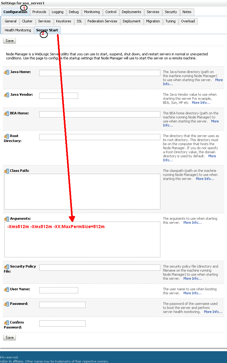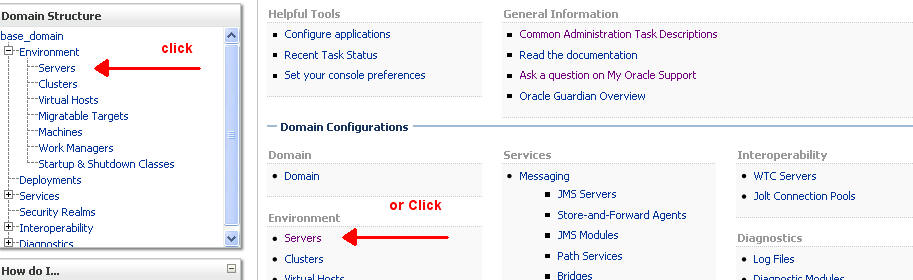 Environment (Shown below) --> Servers (shown below) -- Select Soa_server1 (Shown below) -- Configuration Tab (show above), Server Starts (Show above)
